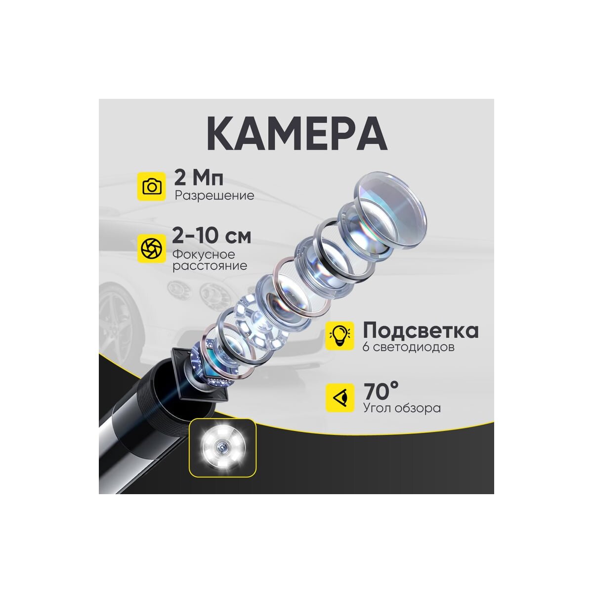 Разрешение матрицы камеры в 2 Мп формирует качественное изображение и передает его на смартфон посредством USB-соединения. В комплект входят 2 кабеля при помощи которых можно подключиться к устройствам с ОС Android или iOS.