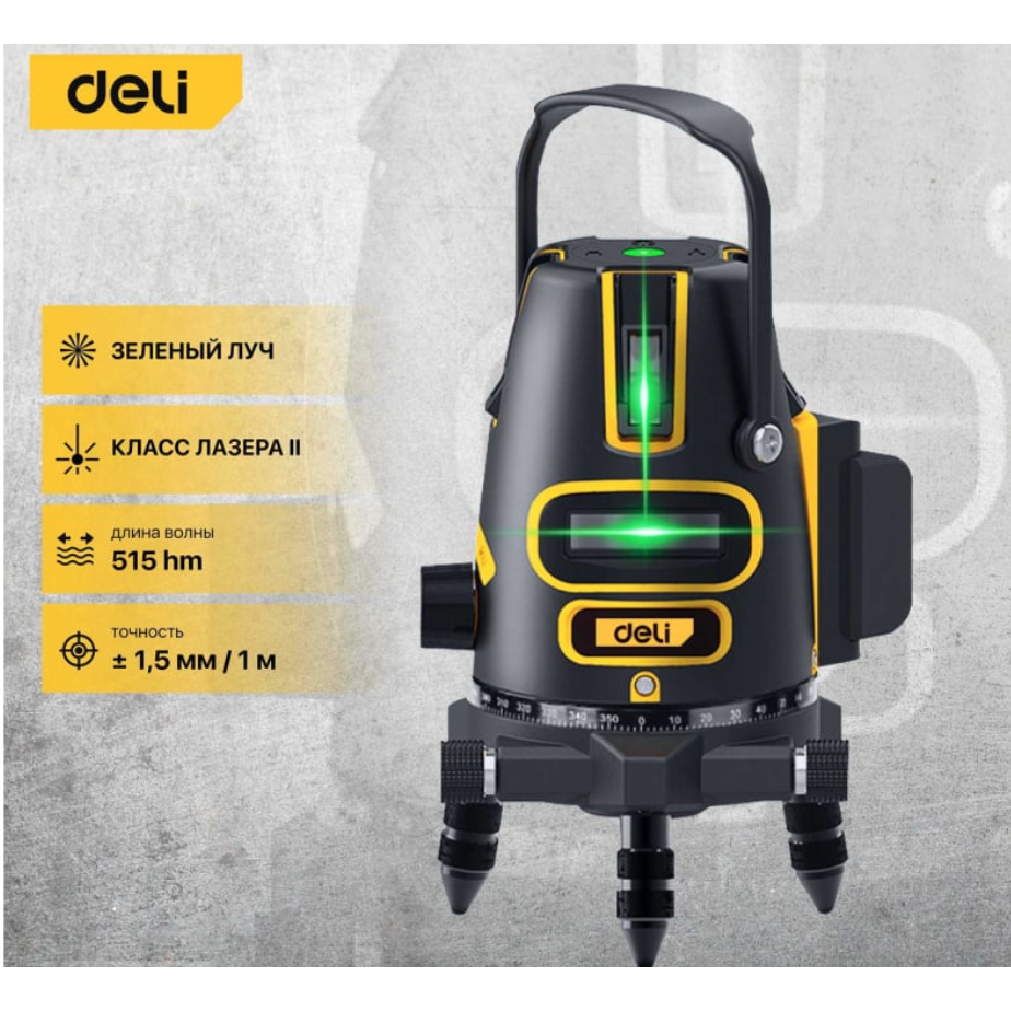 Обладает ярким и хорошо заметным зелёным лучом. Может вращаться на 360° и обладает функцией автоматического выравнивания при наклоне до 3°, а при наклоне более 3° раздаётся звуковой сигнал.