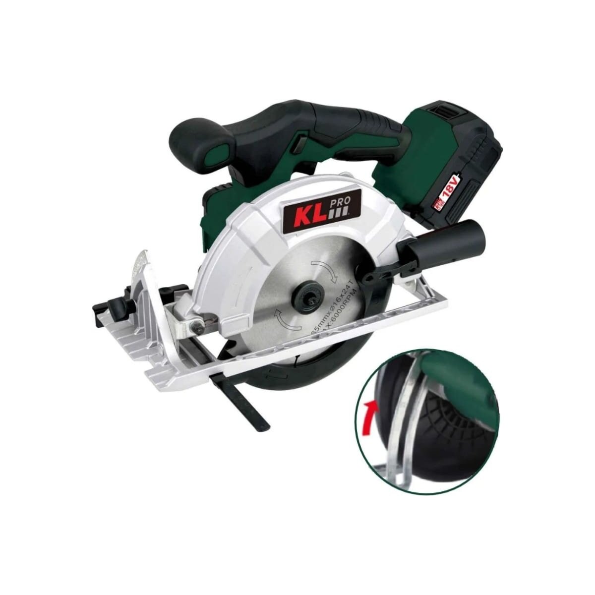 Профессиональная циркулярная пила KLDAT18B-50 с бесщеточным двигателем. Индикатор батареи показывает состояние заряда АКБ. Аккумуляторы большой емкости обеспечивают очень длительное время работы при очень компактном размере.