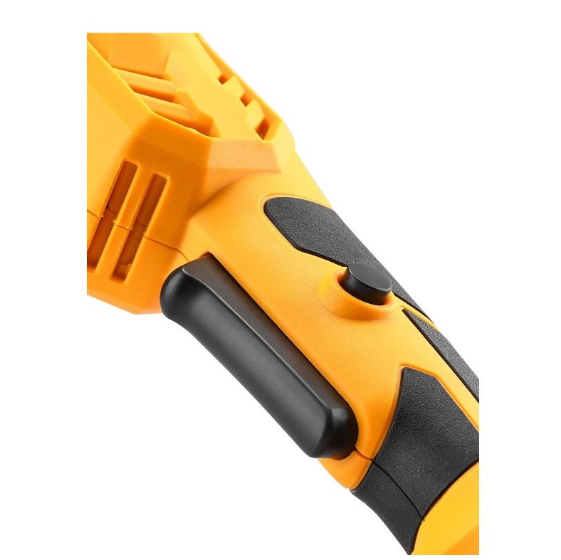 Предусмотрена функция регулировки скорости оборотов. Диск закрыт специальным кожухом для защиты оператора от травм. Наличие дополнительной трехпозиционной рукоятки обеспечивает лучший контроль и безопасность во время работы. Кнопка блокировки шпинделя позволяет быстро и безопасно менять рабочую оснастку. Двигатель защищен от абразивной пыли.