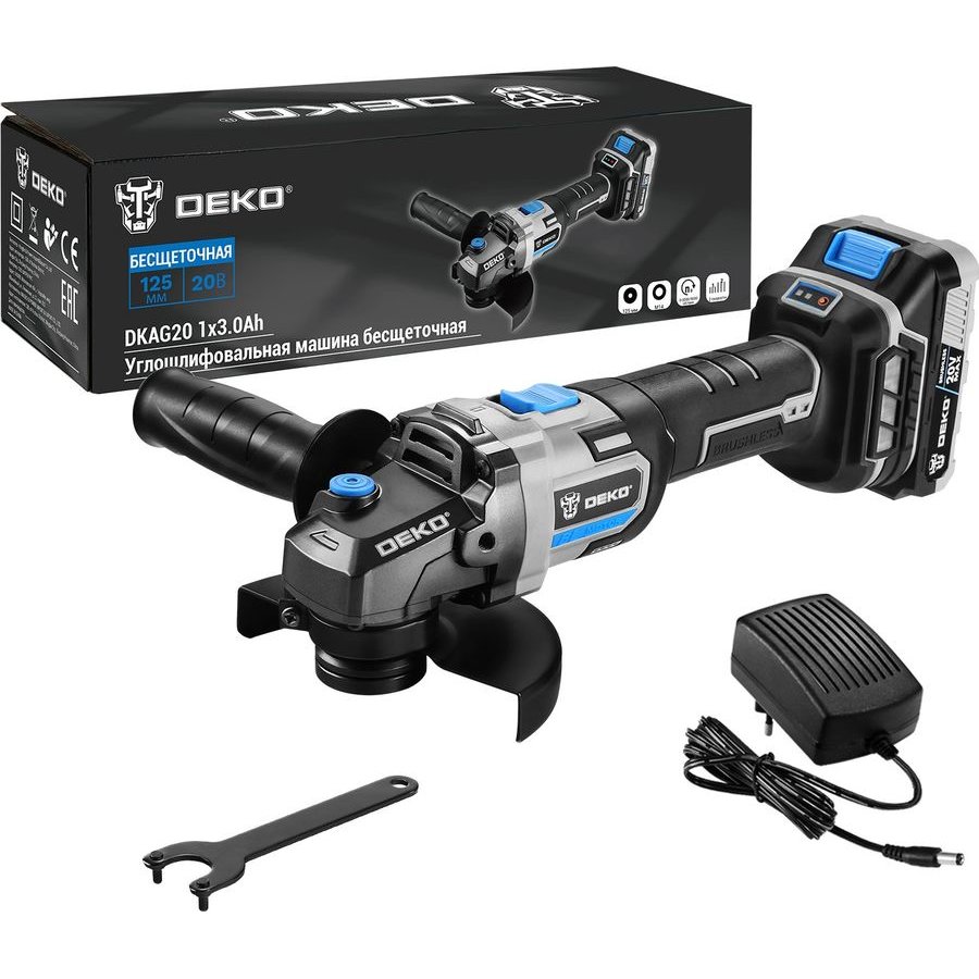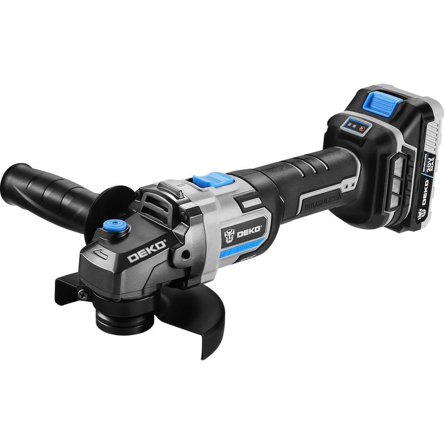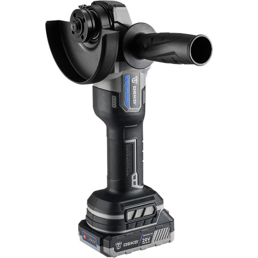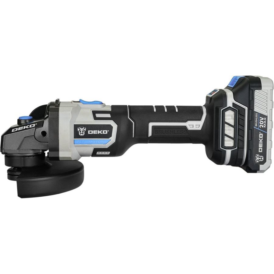 Углошлифовальная машина бесщеточная DEKO DKAG20 совместима с аккумуляторами Makita 18В Li-Ion тип BL-1830, BL-1840, BL-1850, BL-1860. Предназначена для резки, шлифовки, черновой обработки и полировки металлов, камней и керамических изделий с соответствующими насадками.