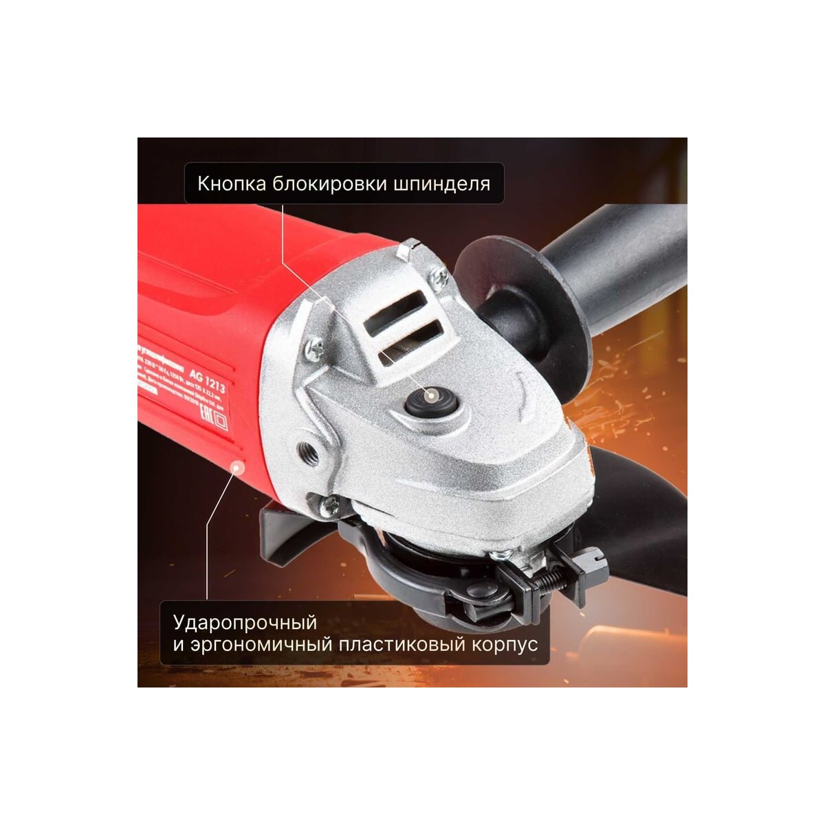 Шлифмашина угловая (болгарка) имеет мощный двигатель с регулировкой оборотов, прочный корпус, быстрорегулируемый защитный кожух и функцию блокировки шпинделя. Оснащена игольчатым подшипником. Имеет пылезащиту (благодаря бронированному ротору и статору). Модель имеет удлинённую рукоятку для удобства работы.