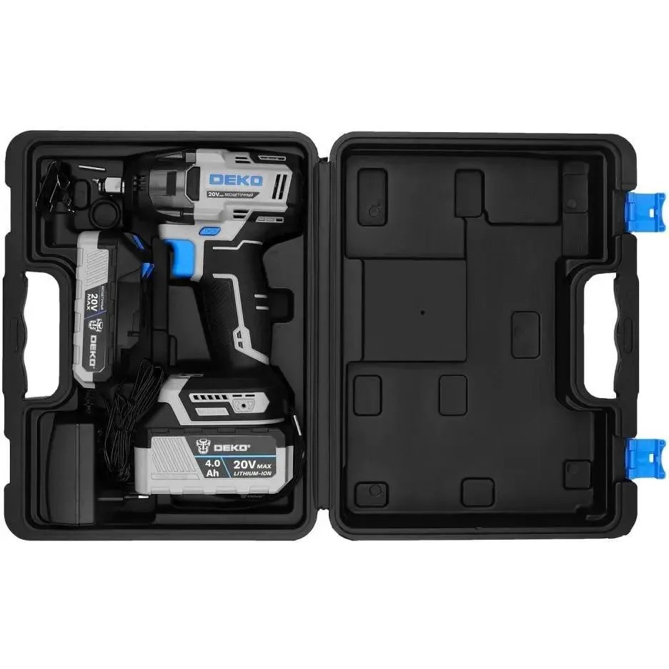 Гайковерт, 2 шт. АКБ, зарядное устройство, скоба поясная, саморез, уплотнительное кольцо, штифт, руководство по эксплуатации, кейс.