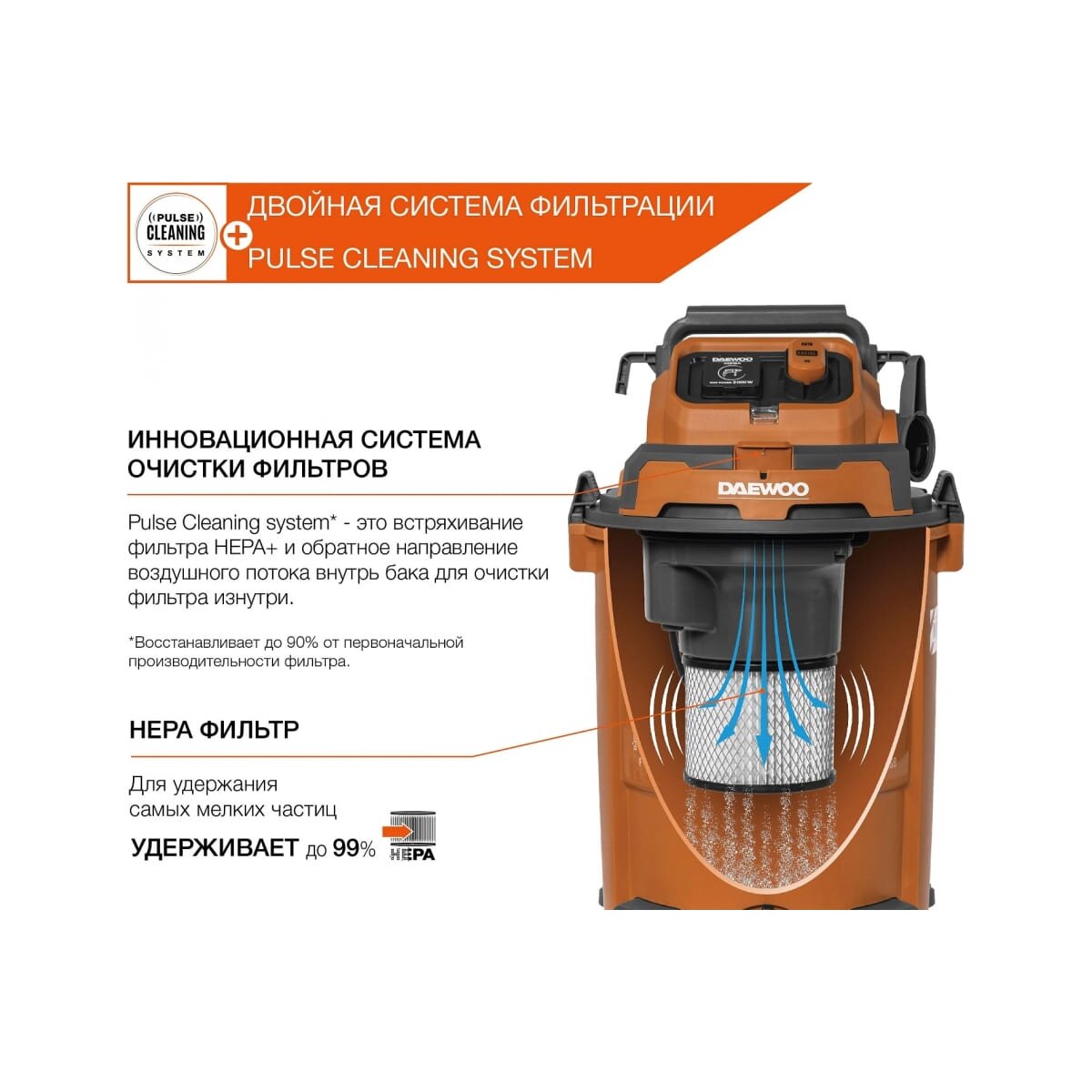 2.Инновационная система очистки фильтров Состоит из 2-х частей: Встряхивание фильтра HEPA+ и обратное направление воздушного потока внутрь бака для очистки фильтра изнутри Восстанавливает до 90% от первоначальной производительности фильтра Активируется простым нажатием кнопки на панели управления