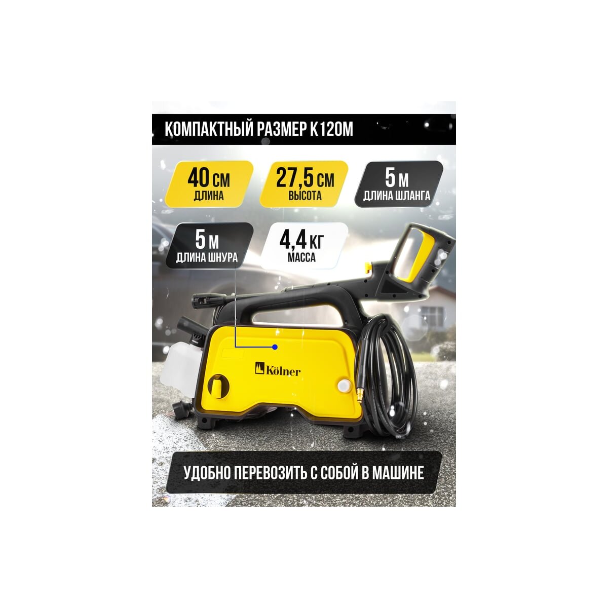 - Компактный размер: мойка легко перемещается и хранится