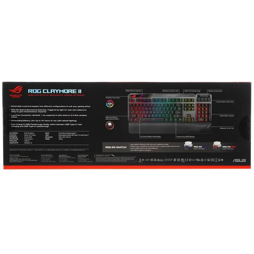 Клавиатура ASUS ROG Claymore II [90MP01W0-BKRA00] разработана для геймеров. Устройство предусматривает подключение проводным и беспроводным способами. Данная модель оснащена оптико-механическими переключателями ROG RX, отсоединяемым цифровым блоком и рядом программируемых клавиш. Одной из примечательных особенностей ASUS ROG Claymore II является настраиваемая многоцветная подсветка. Подставка под запястья обладает приятными тактильными свойствами и повышает удобство длительных игровых сеансов. Клавиатура подзаряжается через интерфейсный разъем USB-C и дополнительно предлагает порт USB Type-A для подключения другого периферийного устройства.