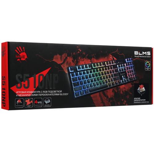 Клавиатура A4Tech Bloody S510NP разработана с учетом потребностей геймеров. Она обладает прочной конструкцией пластикового корпуса и полноразмерной раскладкой с цифровым блоком. Линейные механические переключатели Bloody BLMS RED обеспечивают высокую точность срабатывания каждого нажатия с характерным откликом и отличаются длительным ресурсом службы. Одной из особенностей A4Tech Bloody S510NP является многоцветная светодиодная подсветка, которая формирует эффектный стиль и гарантирует комфорт игры в темное время суток. Клавиатура предусматривает проводное подключение посредством разъема USB и имеет кабель длиной 1.8 м.