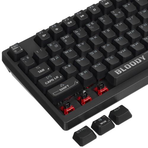 Клавиатура проводная A4Tech Bloody S98 Black выдерживает до 50 млн кликов. Переключатели Bloody BLMS Red Plus не издают громких звуков при нажатии и уменьшают нагрузку на пальцы. Кейкапы изготовлены из пластика высокой жесткости, устойчивого к истиранию символов. Исключить ошибки ввода позволяет интегрированная RGB-подсветка.