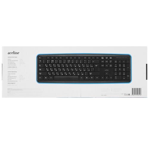 Клавиатура проводная Aceline K-503BU подключается к ноутбукам и стационарным компьютерам с использованием интерфейса USB Type-A и кабеля длиной 1.3 м. Устройство получает питание от USB и не нуждается в дополнительных источниках энергии. Клавиатура поставляется в комплекте из 20 штук.