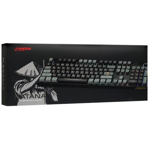 Клавиатура ARDOR GAMING Katana [AG-ZD-104GT-XDA-HS-B] создана для игр. Она выполнена в корпусе черного цвета с самурайской тематикой и оснащена многоцветной светодиодной подсветкой RGB. Модель обладает полноразмерной раскладкой с 104 клавишами. Линейные механические переключатели Gateron Mint с укороченным ходом 2 мм и смазанными стабилизаторами обеспечивают четкий отклик с плавным срабатыванием. Ресурс 80 млн нажатий гарантирует стабильную работу.