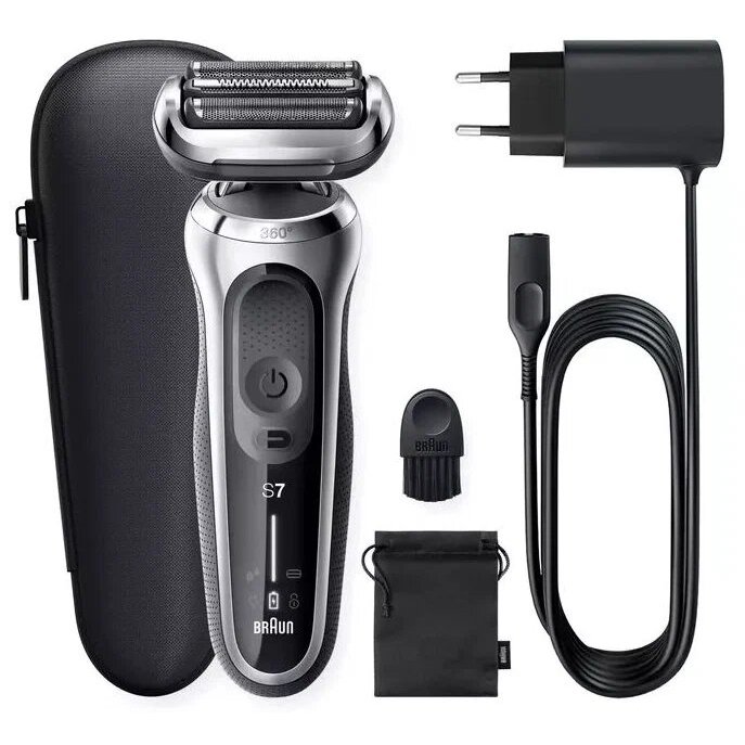 Подробная комплектация: электробритва Braun Series 7, зарядное устройство SmartPlug, дорожный футляр, щеточка для чистки