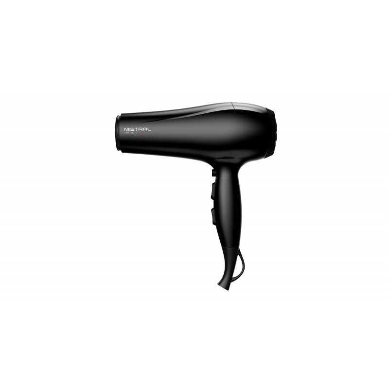 Легкий фен для волос Mistral Ceramic Ion с мощностью 2200 Вт и DC мотором выполнен в классическом черном цвете. Кнопки управления расположены на рукоятке, фен удобно лежит в руке, имеет небольшой вес всего 405 грамм. У него 6 режимов работы: 3 температуры и 2 скорости, а также функция холодного обдува, которая помогает закрепить укладку. В комплект входит одна насадка-концентратор шириной 8 см для сушки и укладки на брашинг.