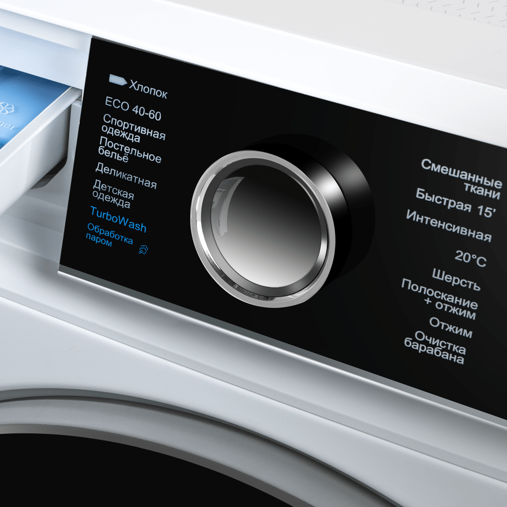 - Особенности: инверторный двигатель, электронное управление, отложенный старт, блокировка от детей, система контроля пенообразования, режим быстрой стирки