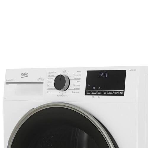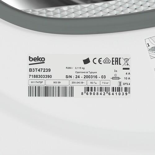 Сушильная машина Beko B3T47239 рассчитана на загрузку до 7 кг белья. Панель управления представлена поворотным механизмом выбора программ и сенсорным дисплеем. Таймер отложенного запуска предусматривает программирование времени включения программы. Подсветка барабана упрощает загрузку и извлечение белья. Система антисминания за счет вращения барабана с небольшой скоростью после сушки уменьшает количество складок на вещах.