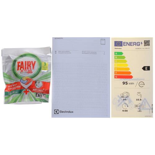 Electrolux EES48200L обладает 8 режимами мойки, программой самоочистки и отсрочкой старта до 24 ч. Сенсорный дисплей отображает активные функции, ход работы и оставшееся время, подсказывает о наличии в отсеках соли и ополаскивателя. Модель с понятной индикацией «луч на полу» по окончании цикла издает звуковой сигнал, отключается и открывает дверцу.