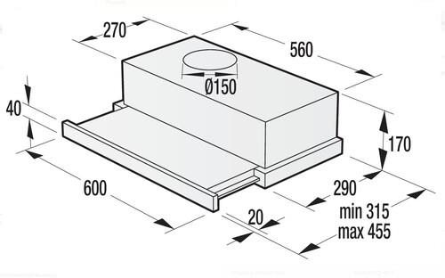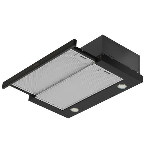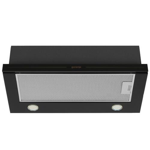 Вытяжка телескопическая Gorenje BHP62CLB полностью встраивается в навесной шкаф. Внизу остается на виду только выдвижная панель, за которой с правой стороны расположена панель управления.Прибор способен работать в режиме отвода и циркуляции. Для первого требуется монтаж воздуховода, соединяющего его с вентиляционной шахтой. Для второго – дополнительная установка (и приобретение) угольного фильтра, способного улавливать неприятные запахи и вредные продукты горения.