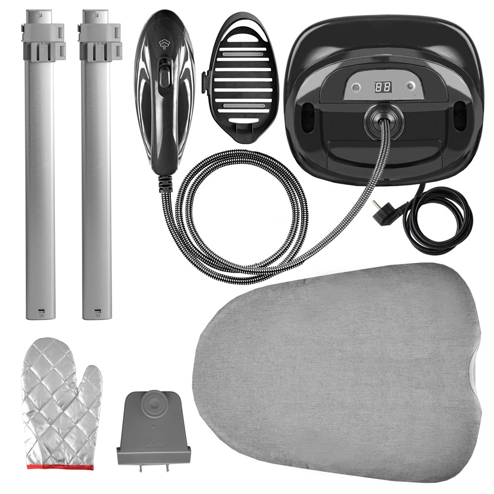 Отпариватель, Гладильная доска, Утюжок, Гибкий паровой шланг, Двойная металлическая телескопическая стойка, Тефлоновая термостойкая защитная рукавица, Руководство по эксплуатации