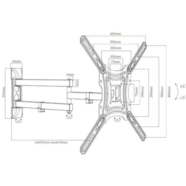 Наклонно-поворотный настенный кронштейн Aspect Line-42 black для телевизоров с диагональю от 26 дюймов, максимальная нагрузка 30 кг, три степени свободы, наклон 15°, поворот 180°, регулируемое расстояние от стены от 55 мм до 610 мм, максимальный стандарт VESA 400x400, цвет-черный.