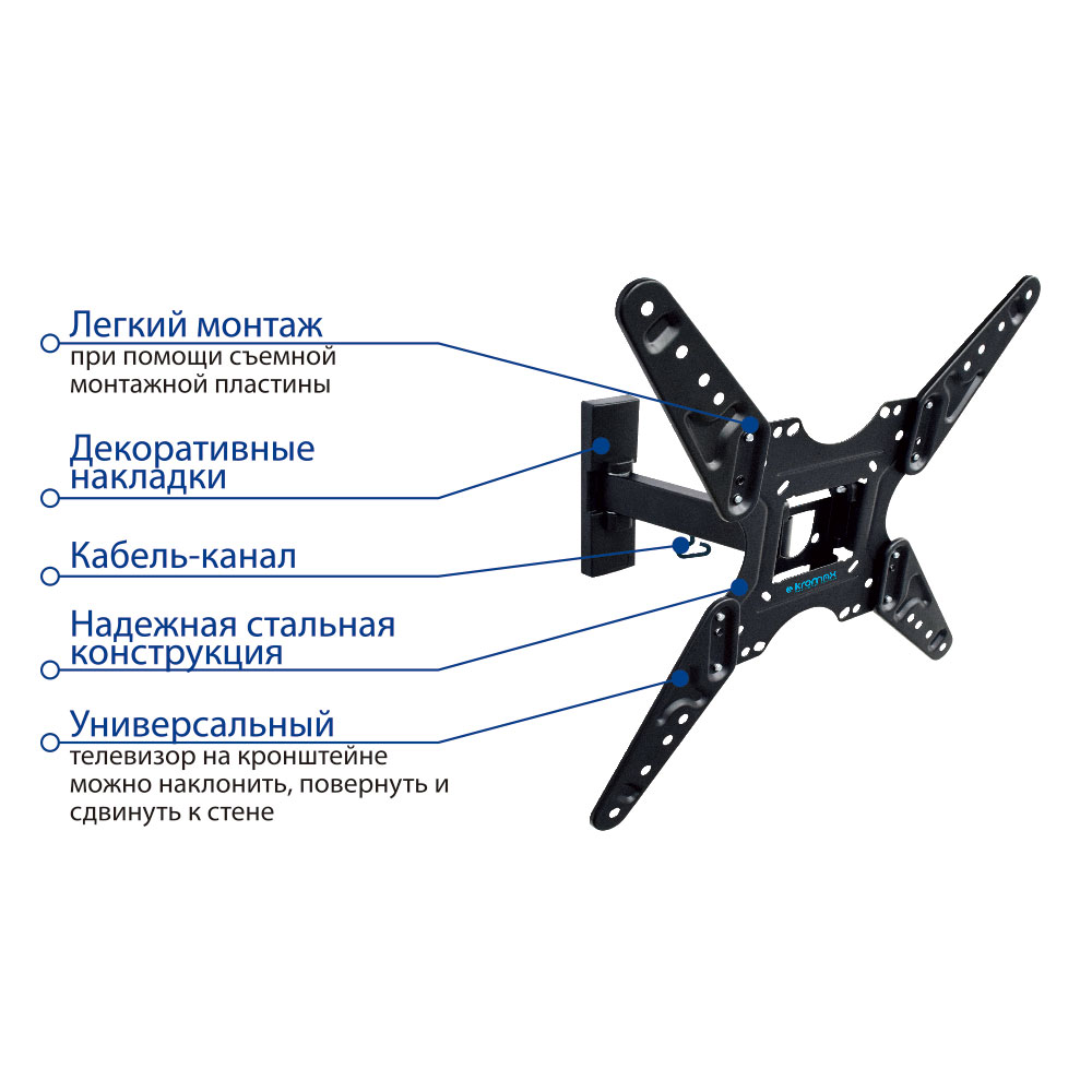 Крепежные отверстия (VESA): 100х100, 100х200, 200х100, 200х200, 300х200, 200х300, 300х300, 200х400, 400х200, 400х300, 400х400