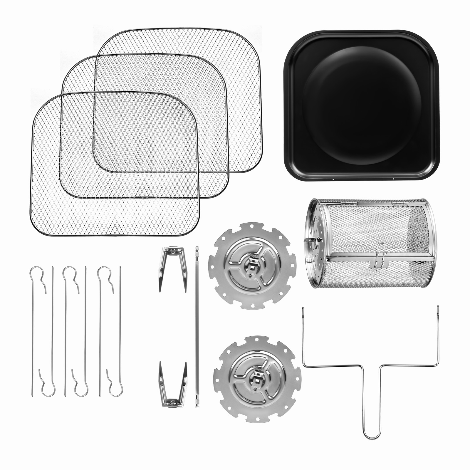 Вращающаяся корзина для картофеля фри, вертел для курицы-гриль с вилками для фиксации, вращающаяся подставка с шампурами, три решетки для запекания или сушки продуктов, поддон для сбора жидкости, металлический держатель, книга рецептов