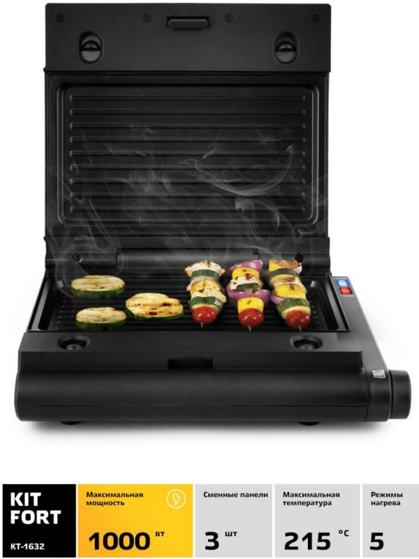 Описание: Контактный электрический мини-гриль позволяет приготовлять стейки, овощи, рыбу, сосиски, котлеты для гамбургеров и многое другое. Сменные панели расширяют возможности гриля. Система крепления на защелках позволяет легко заменять панели.