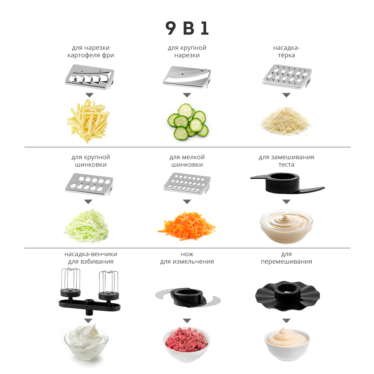9 насадок для обработки продуктов: