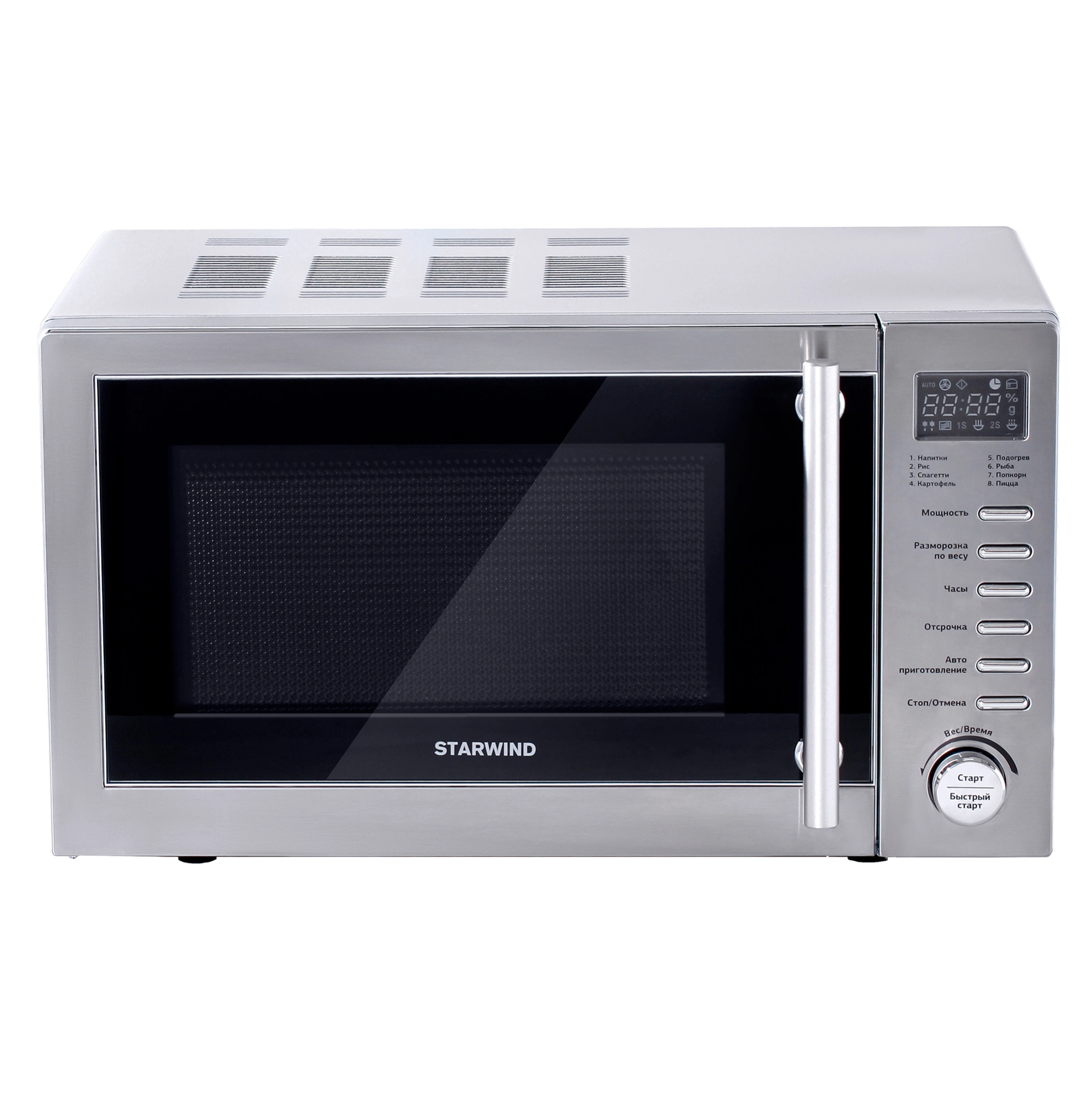 Микроволновая печь STARWIND SMW5320 выполнена в стильном современном дизайне. Корпус серого цвета в сочетании с элементами управления в серебристом цвете позволят идеально вписаться в дизайн любой кухни. Панель управления расположена в правой части прибора. Вверху находится обширная перфорация для вывода горячего воздуха во время работы печи. В нижней части предусмотрены 4 ножки, защищающие поверхность, на которую устанавливается прибор, от повреждений.