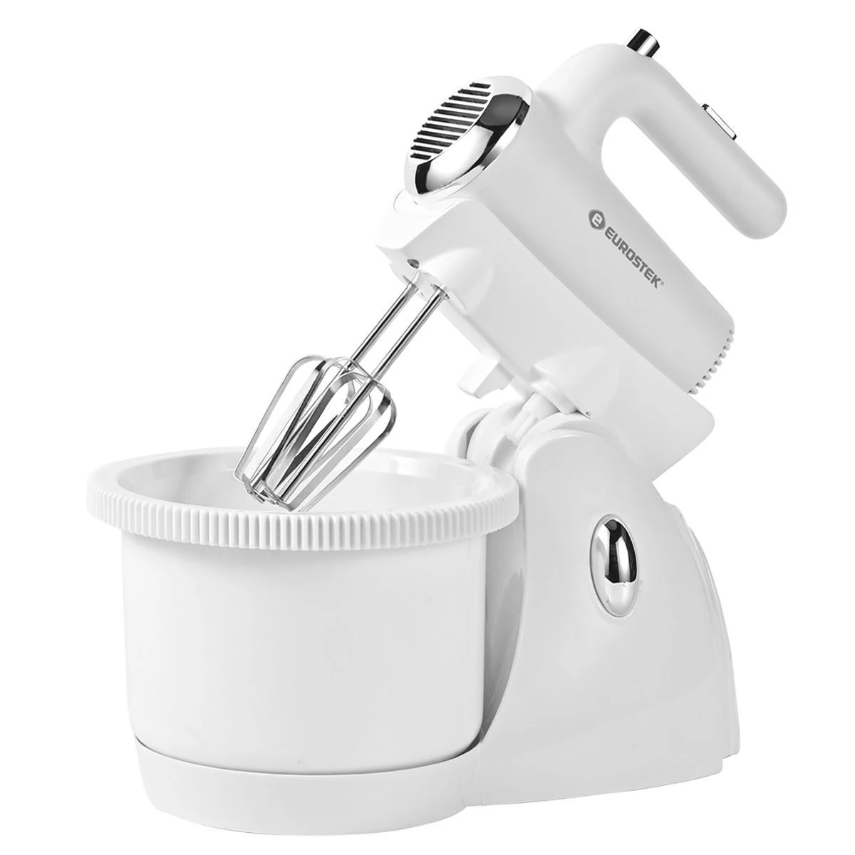Миксер ручной Eurostek EHM-364. Мощность 350 Вт, 5 скоростей, объем вращающейся пластиковой чаши 2.5 л., насадки для замешивания теста, насадки для взбивания, эргономичный дизайн.