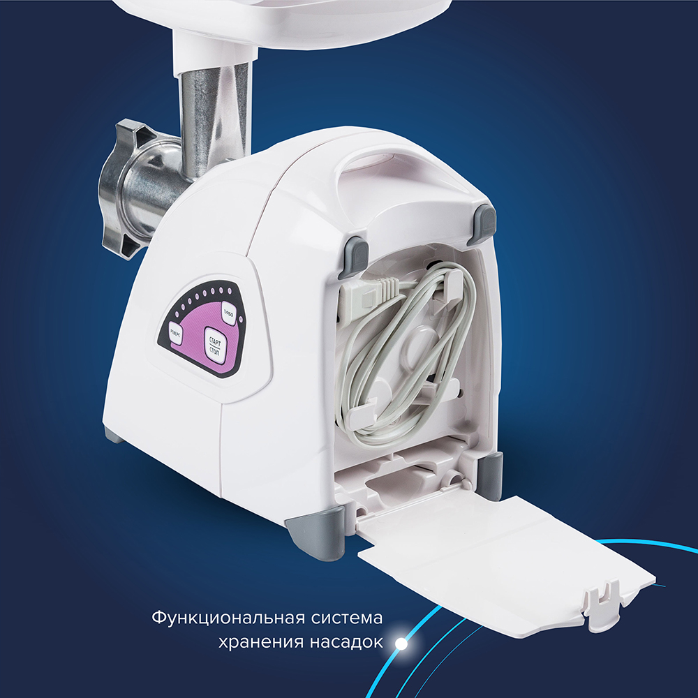 Высокое размещение шнековой камеры дает возможность использовать глубокую чашу для фарша